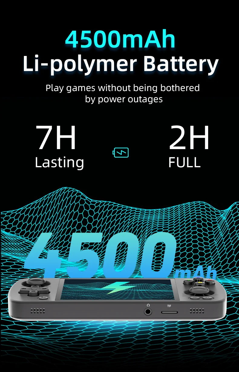 Li-polymer battery 4500 mAh, charging 2hours, battery life 7 hours |