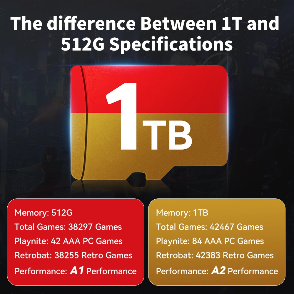 In response to the needs of the majority of buyers, we have added a 1TB game card version based on the 512G version. Compared with the 512G version, it has a larger storage space, more games, and the performance has been upgraded to A2 performance. Compared with the A1 performance game card, the reading and writing speed is twice as fast, giving buyers a smoother gaming experience (512G card is still A1 version). Buyers can choose the specifications they need according to their needs